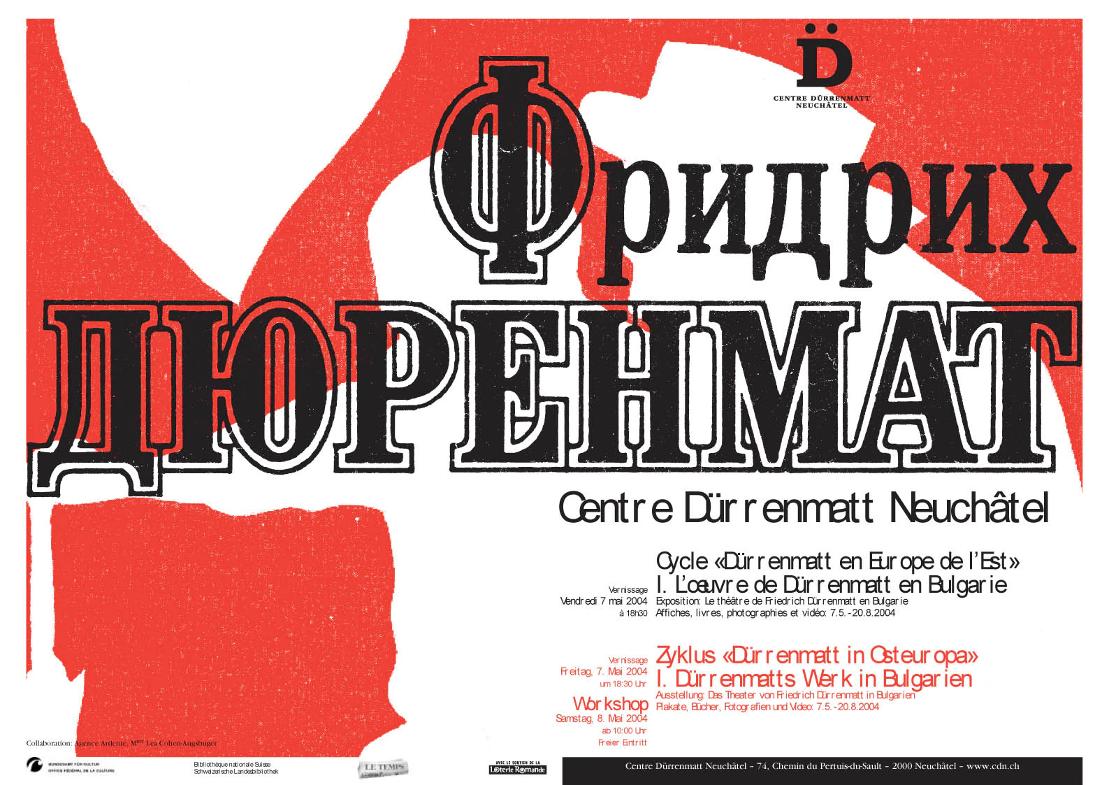 Das Centre Dürrenmatt beherbergt zum einen Dürrenmatts Bildwerk, das neben seiner schriftstellerischen Produktion im privaten Rahmen entstand. Zum andern hat sich das Centre auch zum Ziel gesetzt, Dürrenmatts literarisches und dramatisches Werk immer wieder neu und unter anderen Aspekten zur Diskussion zu stellen und auf seine Aktualität hin zu befragen. Eine besondere Aufmerksamkeit gilt dabei der reichen und vielfältigen Aufführungstradition seiner Stücke in Mittelund Osteuropa, in den ehemaligen Ostblock-Ländern. Nicht nur zeigte Dürrenmatt selbst grosses Interesse an diesen Aufführungen und pflegte Kontakte unter dem eisernen Vorhang hindurch. Vielmehr kommt darin auch eine im Westen kaum bekannte Aufführungstradition dieser Stücke zum Vorschein. Dürrenmatt selbst bezeichnete seine Theatertexte als «Partituren», die von den Regisseuren und vor allem von den Schauspielern erst zum Leben erweckt würden. Dank der Zusammenarbeit mit Léa Cohen-Augsburger wird es uns möglich, im Centre Dürrenmatt mit einer Plakatausstellung und der Videoaufzeichnung einer aktuellen Aufführung, aber auch mit Vorträgen von bulgarischen Spezialistinnen und Spezialisten Dürrenmatts Präsenz als Dramatiker in diesem Land vorzustellen.