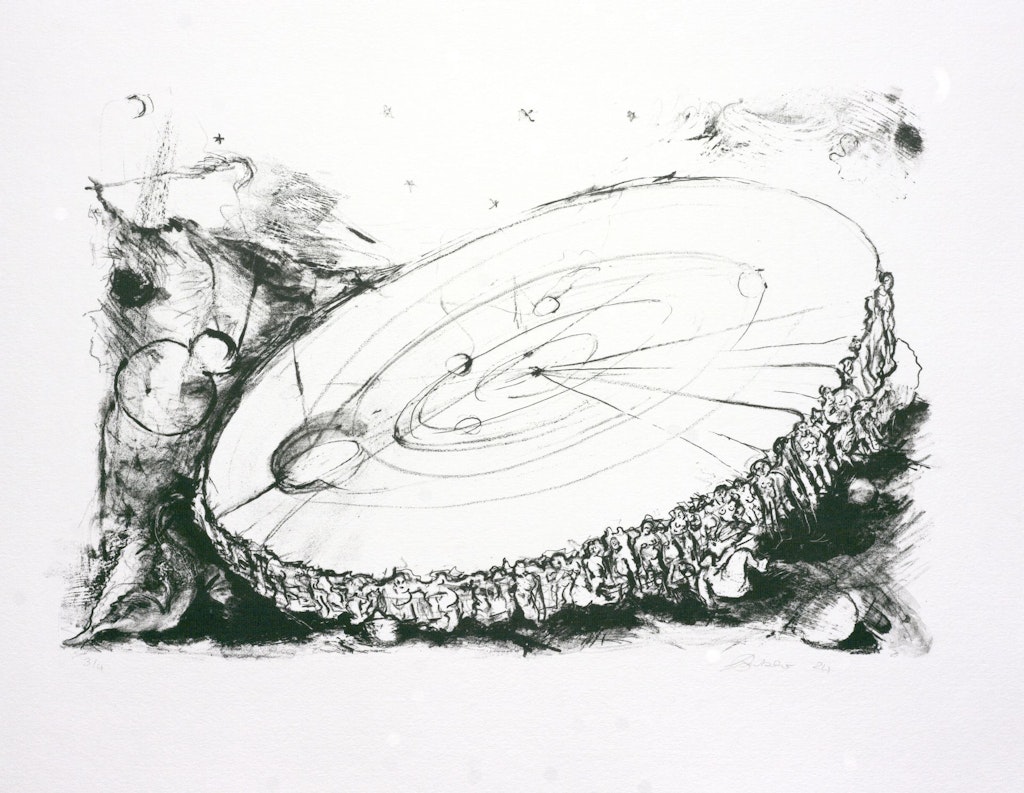 Die Lithografie ist ein aufwändiges Druckverfahren, bei dem eine durch Schleifen, Zeichnen und Ätzen präparierte Kalkschiefersteinplatte mit einer Walze wiederholt eingefärbt wird, bis schliesslich der Druck auf Papier erfolgen kann.