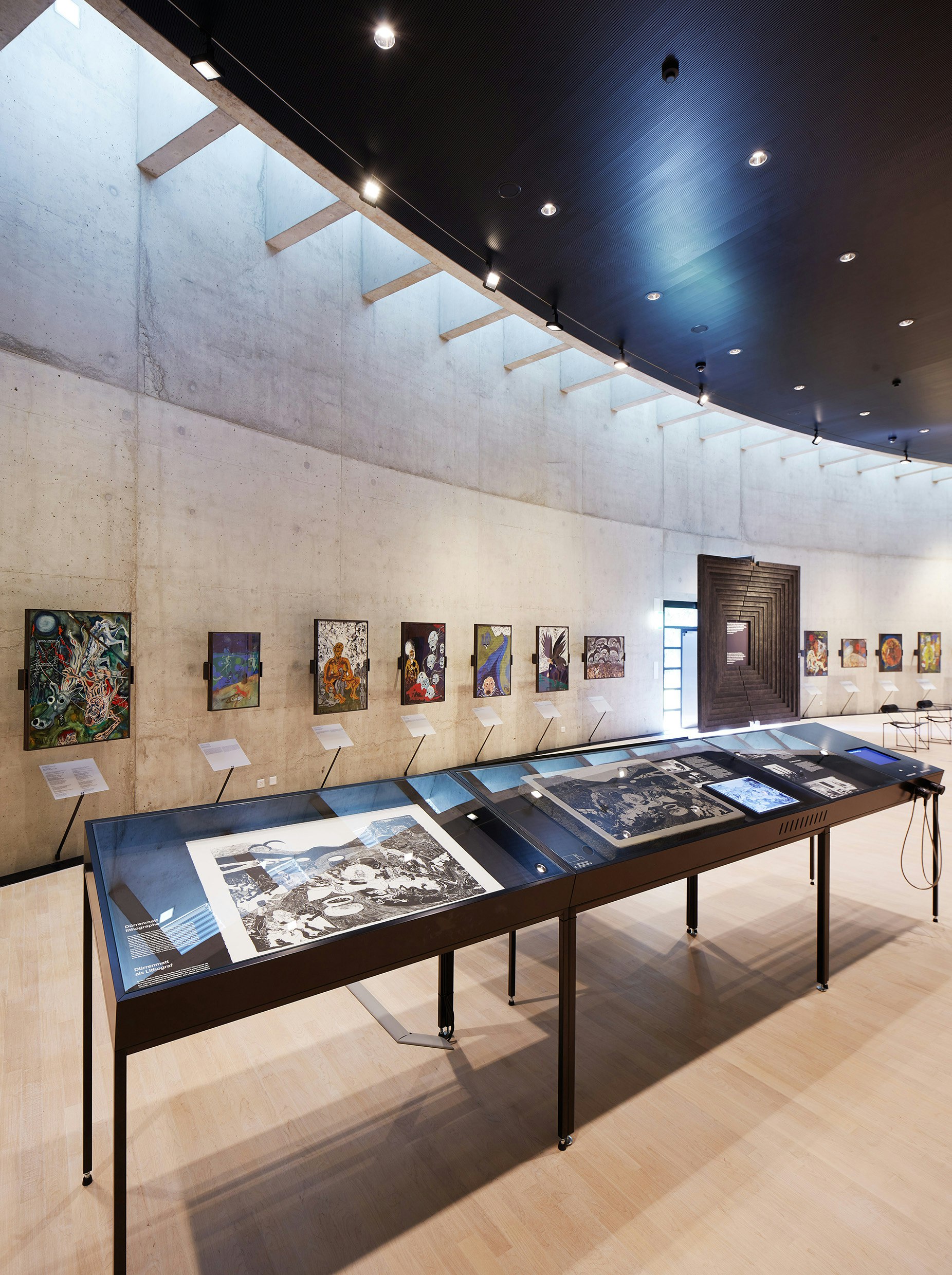 Im grossen Saal im dritten Untergeschoss sind Gouachen von Friedrich Dürrenmatt sowie eine Auswahl an Zeichnungen und Lithografien zu den zentralen Themen seines Werks zu sehen: der Minotaurus, der Turm zu Babel oder Atlas. Mittels einer interaktiven Station erfährt man mehr über die ausgestellten Werke.