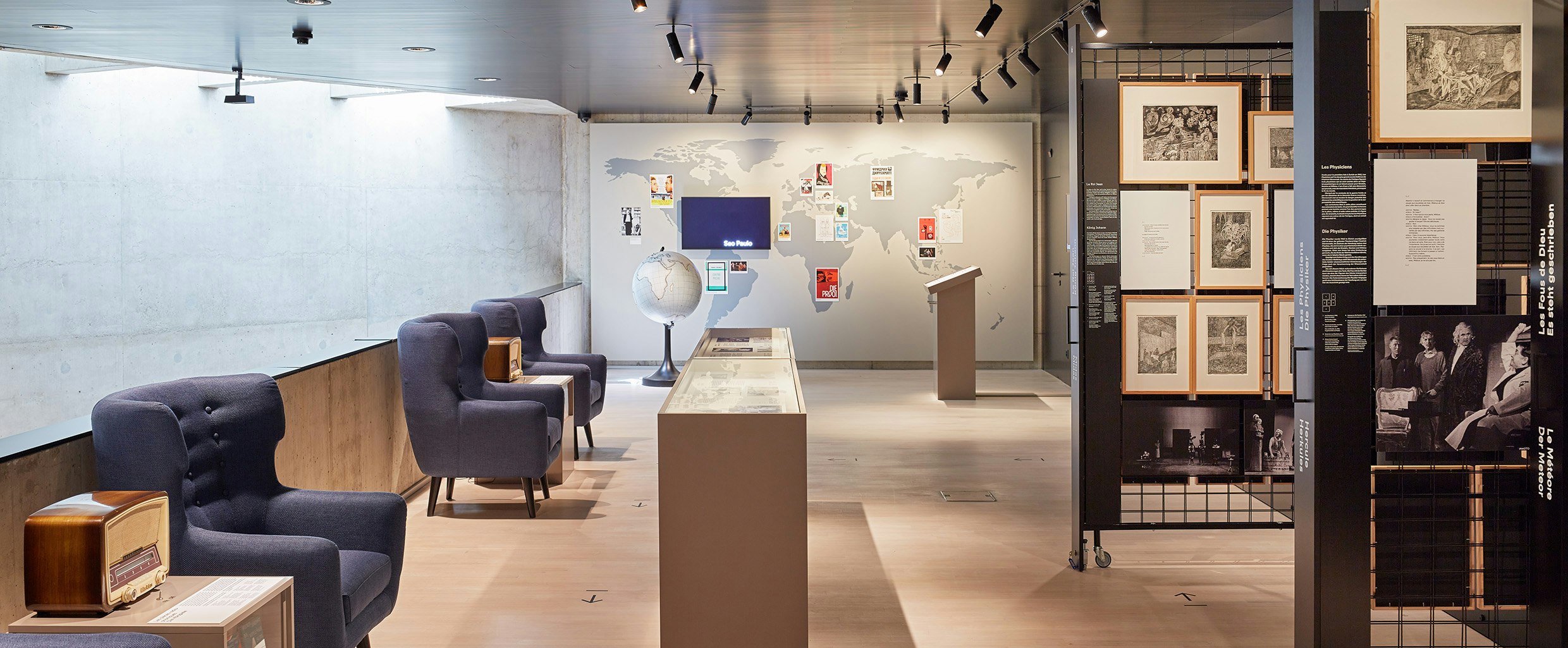 Welche Beziehungen hat Dürrenmatt zu Senegal, Japan oder Norwegen? Die interaktive Weltkugel zeigt die Ausstrahlung seines Werks rund um den Globus und die Reisen, die ihn inspiriert haben. Auf einer interaktiven Karte der Schweiz entdeckt man Dürrenmatts Beziehungen zu Basel, Locarno und anderen Orten des Landes.