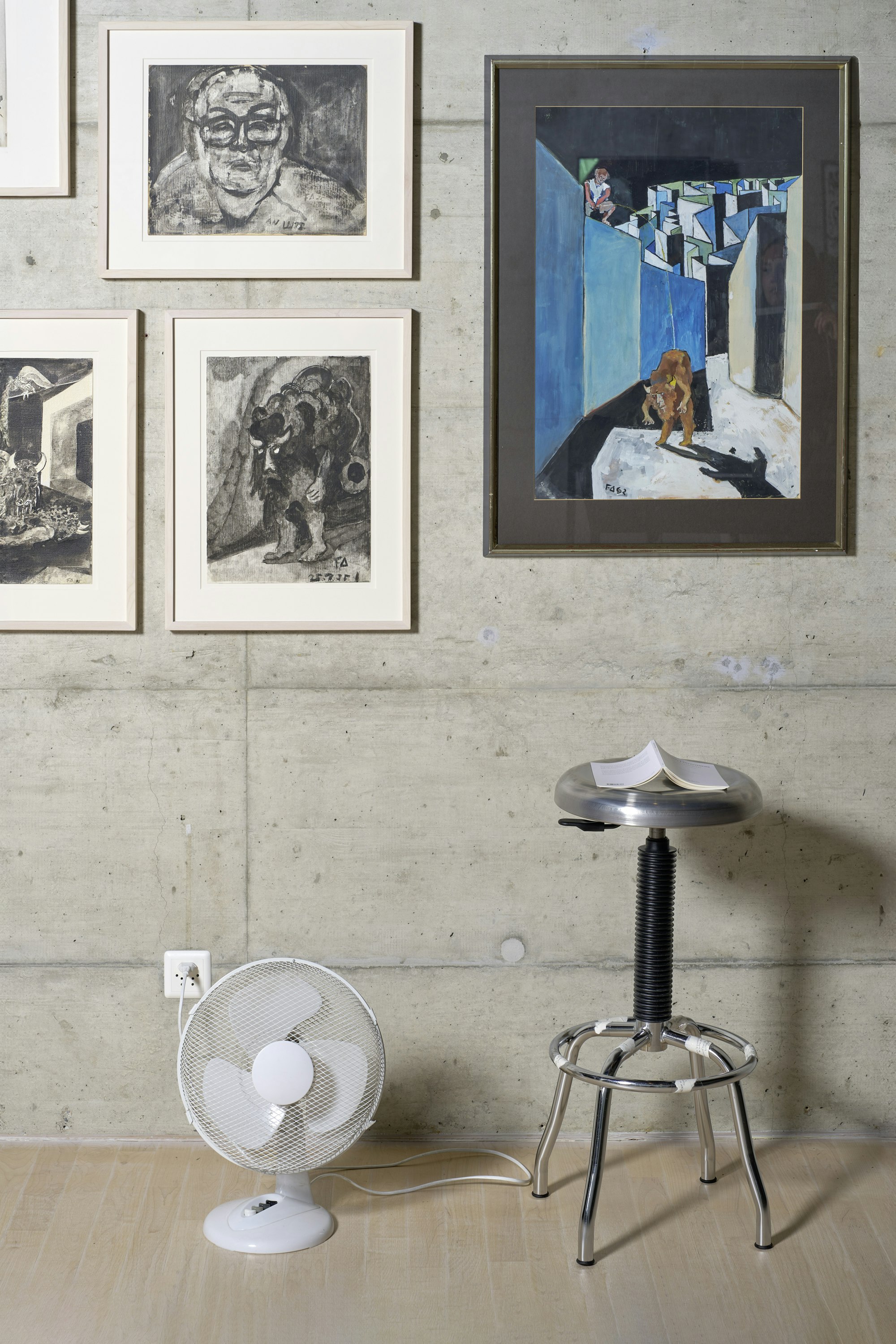 Neben dem Ventilator liegt einesseiner Exemplare, Die Physiker, auf einem Metallhocker. Es suggeriert eine unvollendete Lektüre und hält die behandelten Themen in einer eingefrorenen Zeit fest.