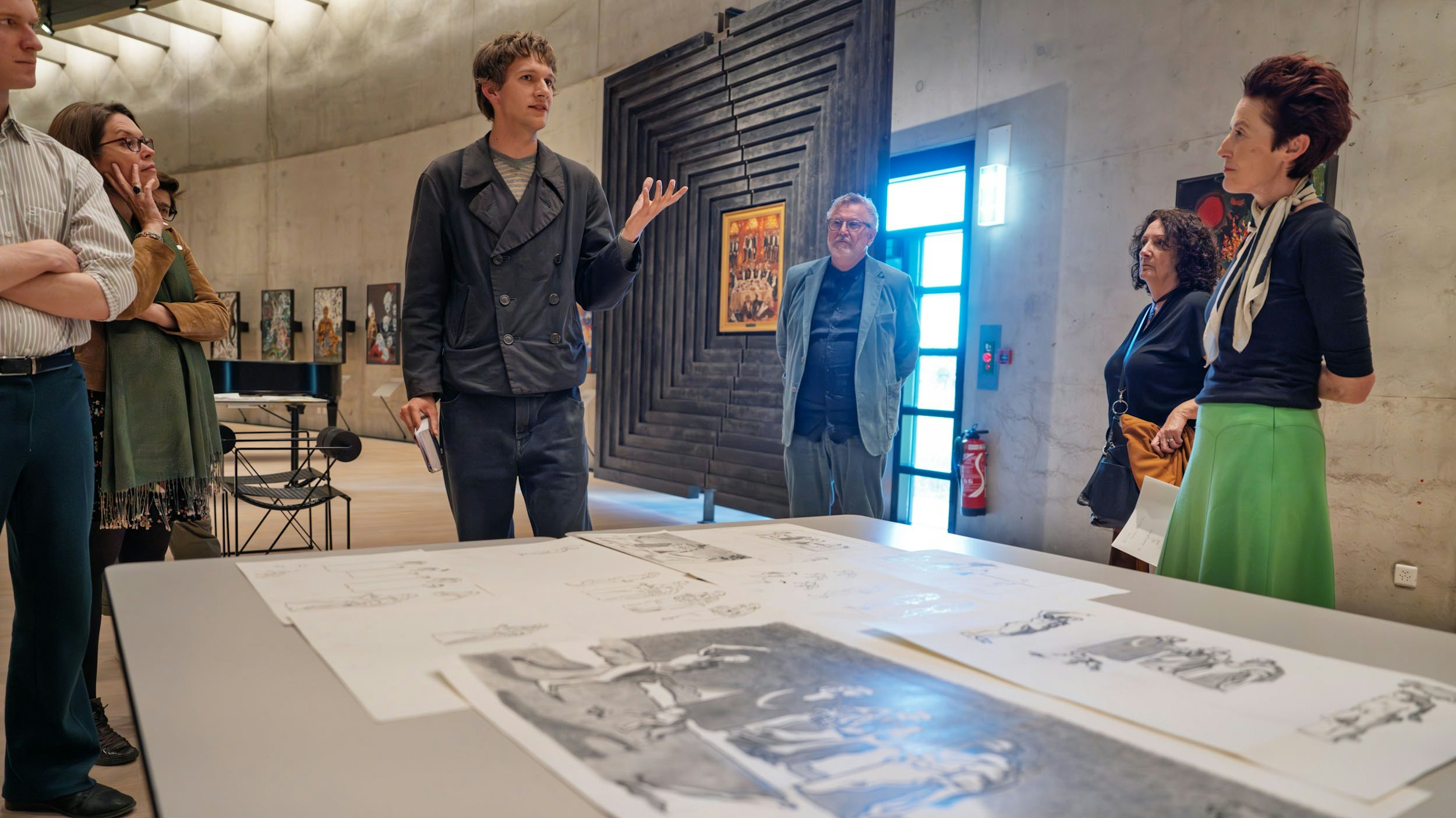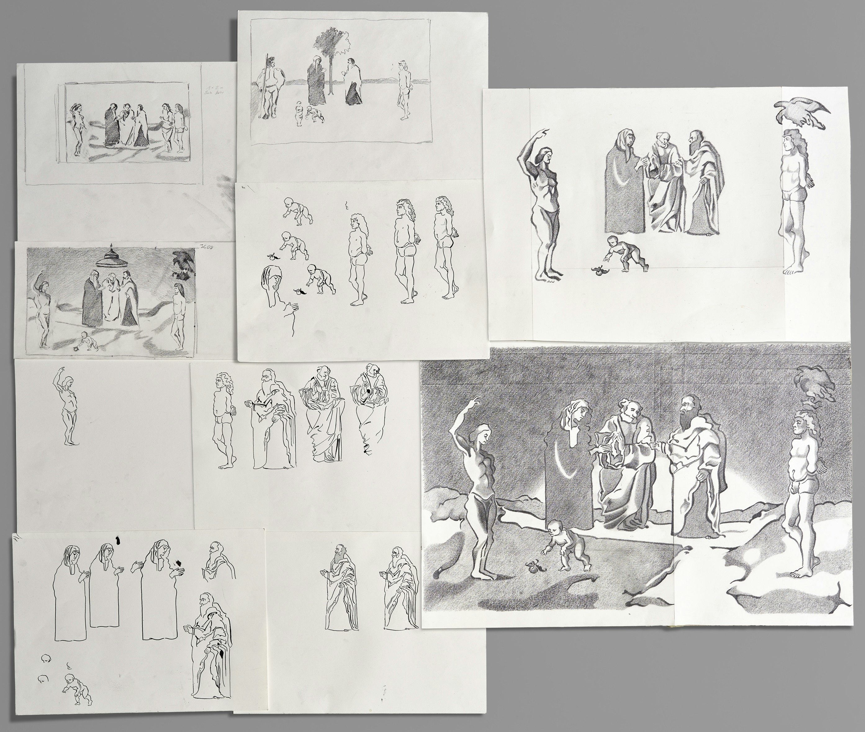Während der Residency hat Linus einen Entwurf für eine Malerei eines visionsartigen Szenarios angefertigt. Hierfür hat er Figuren aus Gemälden Giovanni Bellinis und Piero di Cosimos referenziert, indem er sie zeichenhaft auflöst und neu anordnet. Wie in Dürrenmatts bildnerischen Arbeiten, versuchte er hier die Atmosphäre eines Filmstils einzufangen, so als ob die dargestellte Situation eingefroren wäre.