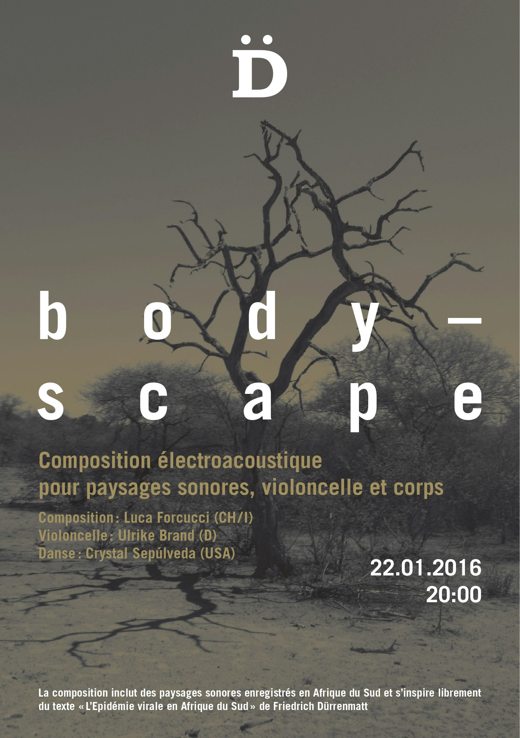 Performance créée spécifiquement pour le lieu dans laquelle elle est présentée, Bodyscape est une composition électroacoustique qui prend la forme d’un work in progress. Le projet, initié en juillet 2015 à San Francisco, explore principalement le corps en tant que source sonore. L’information est collectée par des capteurs biologiques et des micros qui enregistrent et amplifient les mouvements générés par le corps. A l’intérieur de cet écosystème, une danseuse produit des sons et des données physiologiques, souvent inaudibles. Ceux-ci sont amplifiés, traités et renvoyés dans l’espace de la performance, où le corps de la danseuse interagit à nouveau avec eux, provoquant un « biofeedback ». La composition inclut également des paysages sonores enregistrés récemment en Afrique du Sud. Une violoncelliste inscrit l’instrument dans un dialogue entre les paysages sonores et le corps. Le texte de Friedrich Dürrenmatt intitulé L’Epidémie virale en Afrique du Sud, parabole politique sur l’Apartheid, sert également de matériau à la composition.