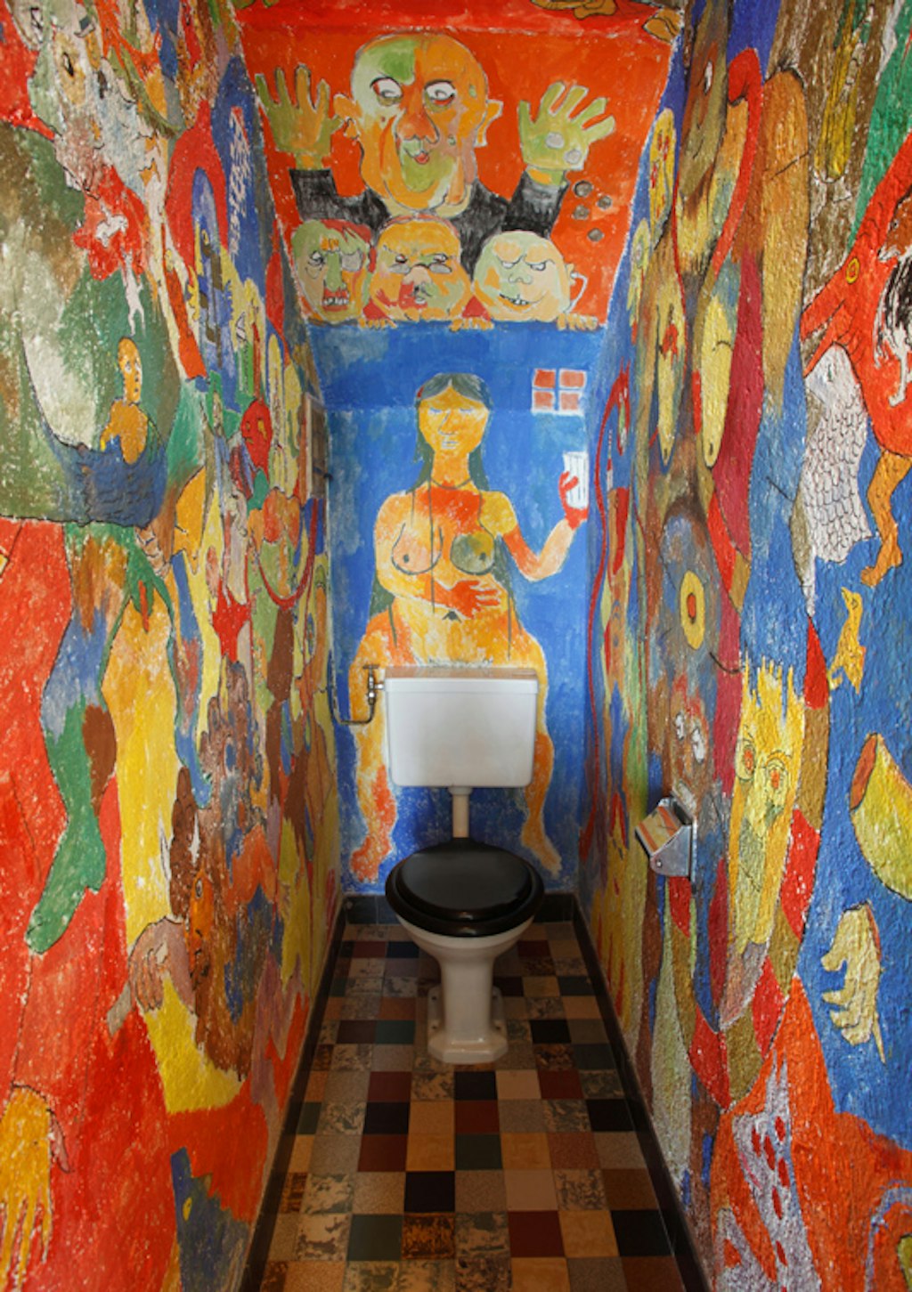 From the early frescoes he painted in his student attic room in Bern, Friedrich Dürrenmatt painted murals in almost every place he lived. In the mid-1960s, he painted a vividly-coloured and joyous fresco in the toilet of his Neuchâtel home.