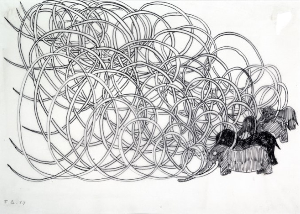 Friedrich Dürrenmatt, [4 Mammuts], 1967, pennarello su carta, 29.5 x 41 cm, collezione Beatrice Liechti — © Centre Dürrenmatt Neuchâtel/Confederazione svizzera.