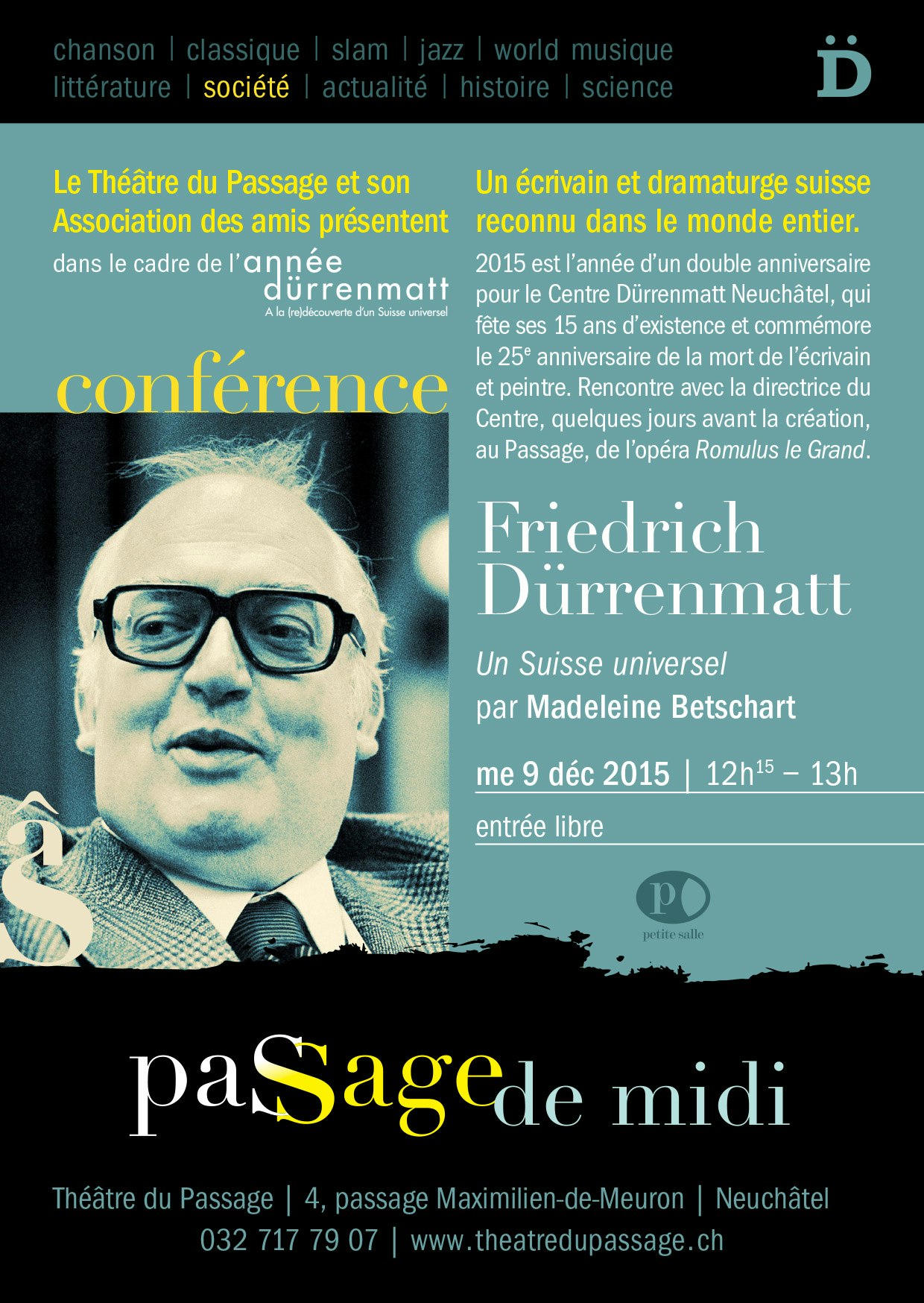 Extra-muros: « Friedrich Dürrenmatt, un Suisse universel » Conférence de Madeleine Betschart au Théâtre du Passage, Neuchâtel