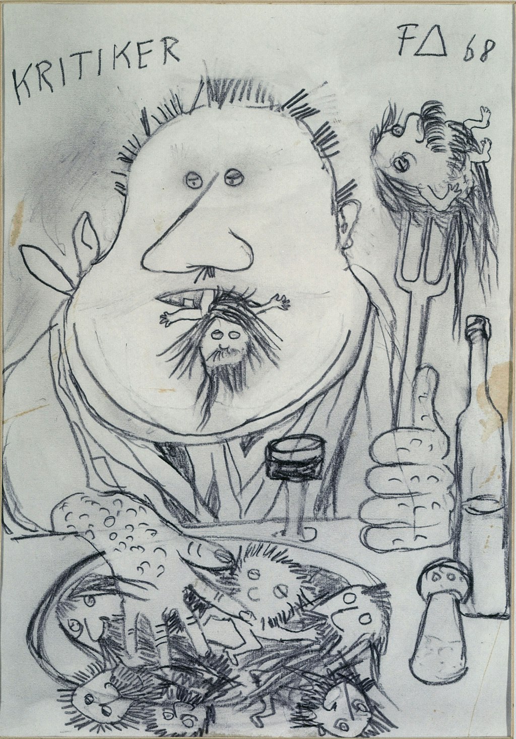 Dans les textes et les œuvres de Dürrenmatt liés à la nourriture, le thème du cannibalisme revient fréquemment. Chez l’écrivain et peintre, le motif renvoie à des imaginaires variés, de la figure du sauvage à la symbolique cannibale dans la religion, en passant par le cannibalisme « amoureux » ou le cannibalisme comme acte de vengeance.