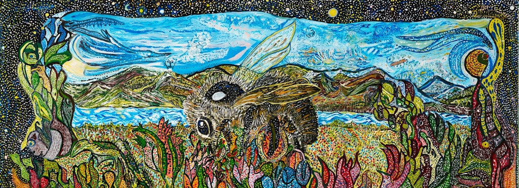 La nouvelle œuvre «Le Monde des abeilles» de Ruth Dürrenmatt est constituée de huit magnifiques tableaux sur bois très colorés. Une nature foisonnante peuple ces tableaux. On y trouve des animaux de la forêt du vallon de l’Ermitage, où elle a grandi, mais aussi de forêts tropicales de Floride où elle a vécu.