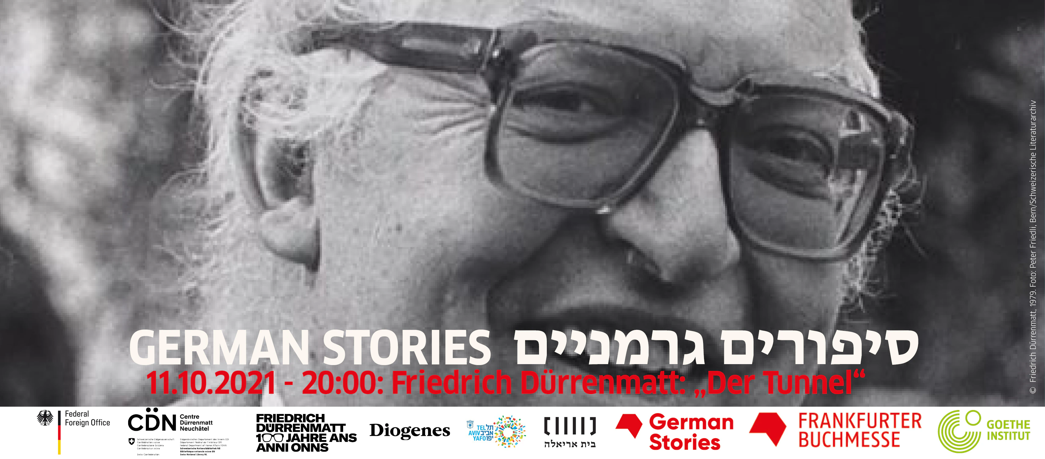 À l'occasion du 100e anniversaire de l'écrivain suisse Friedrich Dürrenmatt, l'ambassade de Suisse et le Goethe-Institut Israël vous invitent à la première lecture scénique en hébreu de la nouvelle "le tunnel » par l'acteur suisse israélien Meni Gross à la bibliothèque Beit Ariela de Tel Aviv le 11 octobre 2021.