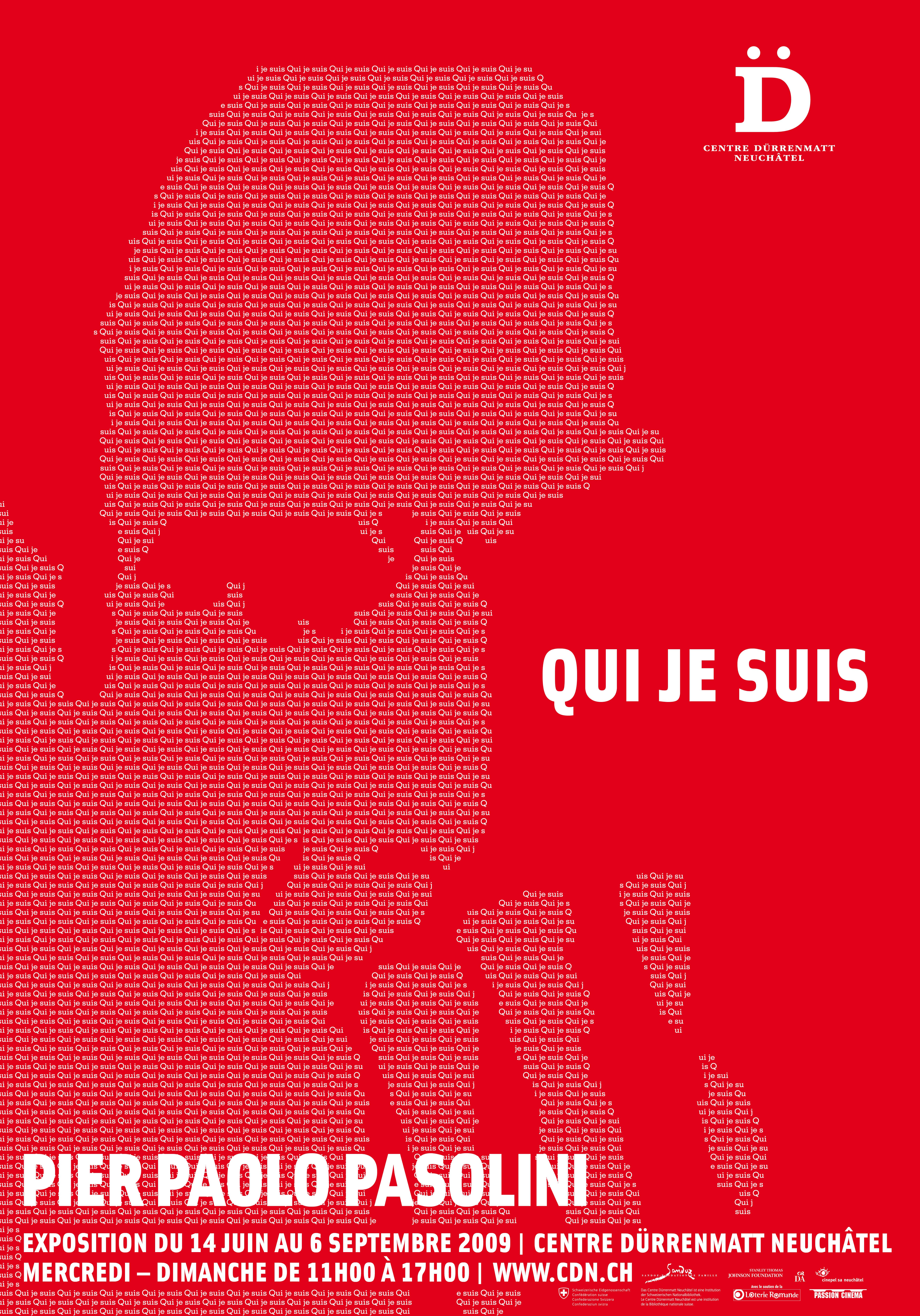 Dal 14 giugno al 6 settembre il Centre Dürrenmatt ospiterà la grande esposizione estiva «Pier Paolo Pasolini. Wer ich bin - Qui je suis», che presenterà i molteplici aspetti della personalità e dell'opera del cineasta, scrittore e pittore italiano Pier Paolo Pasolini (1922-1975). Provocatore e anticonformista, Pasolini si rivela un personaggio sensibile e interessante, complesso ma allo stesso tempo affascinante per le sue contraddizioni. L'esposizione, che si svolgerà lungo un abbecedario ispirato al testo autobiografico Who I am, immergerà i visitatori nell'estetica pasoliniana e, più in generale, nel fervido universo dell'autore italiano.