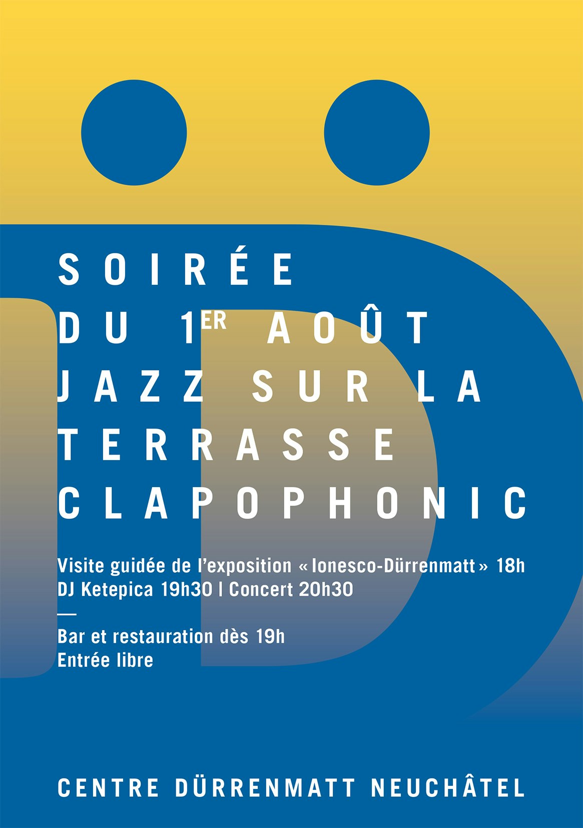 À l’occasion de la fête nationale suisse, le Centre Dürrenmatt Neuchâtel propose à une soirée festive sur sa terrasse avec un concert de jazz, avant de suivre les feux d’artifice. En préambule aura lieu une visite guidée de l’exposition temporaire actuelle.